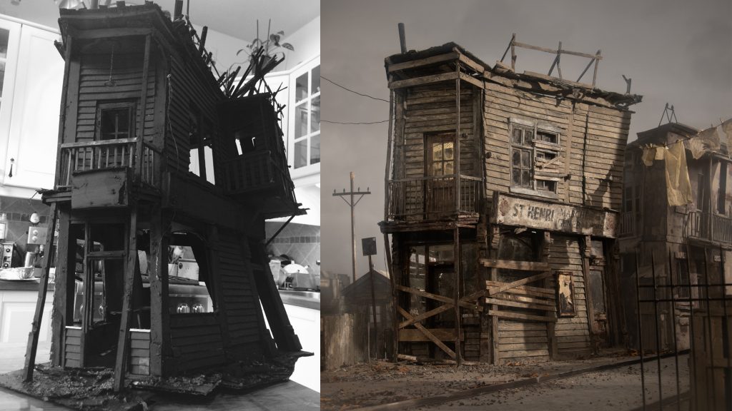 While constructing the set—inspired by Montreal at the beginning of the 20th century—misfortune influenced the look of the run-down house. The filmmakers explained: “The original maquette of the house was left outside our studio to dry. An unexpected rain squall hit and by the time we returned, the prop was warped out of shape. But actually, it looked so much better that way, so we incorporated the warps into the final model.”
