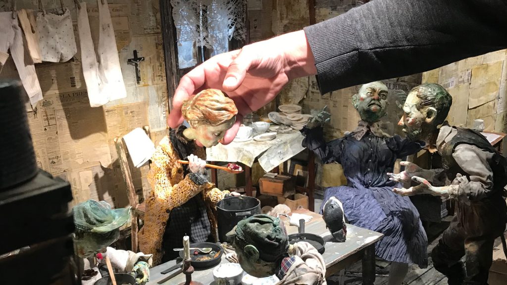They decided that CG mouth animations would only be used for scenes set in the present, while for scenes set in the past, the puppets would have fixed expressions: they could only emote through gesture and pantomime. The modern-day puppets would be painted in silicone, while the characters from the past would be painted in oil, evoking wooden church idols or puppet theatre marionettes. The contrast between the two styles, past and present, modern and nostalgic, perfectly suited the themes of the film.