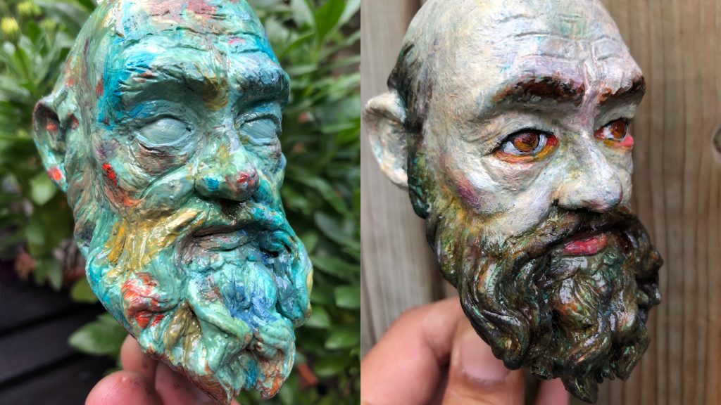 During the first few weeks of COVID lockdown, Chris and Maciek were forced to build puppets separately in their homes (one sculpting the heads, the other the bodies); they only met occasionally—“in some back alley, six feet apart”—to check each other’s progress. A scale mix-up led to the heads being much bigger than the bodies. This should have been a disaster, costing weeks of work, but the filmmakers decided to embrace the mistake, and oversized heads became a part of the film’s aesthetic.